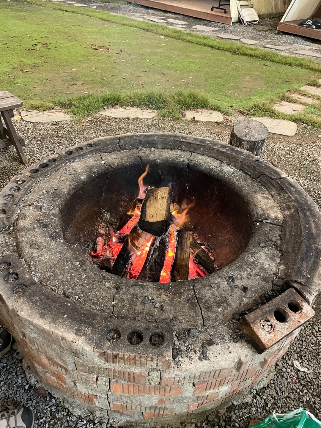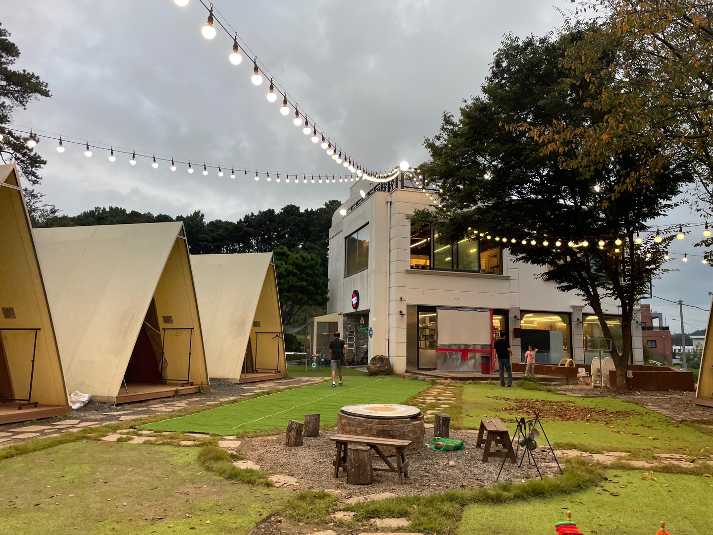 가운데 잔디밭에는 장작으로 불을 피워 놓아서~ 불멍때리며 둘러앉아 얘기도 나누고 게임도 하고~