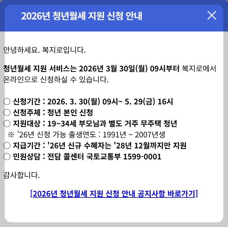 청년 월세 지원은 단순히 돈을 지원해 주는 것을 넘어, 청년들이 주거 불안에서 벗어나 학업과 취업 준비에 전념할 수 있도록 돕는 든든한 버팀목입니다. 2026년부터는 신청 문턱이 낮아진 만큼, 본인이 대상자인지 지금 바로 '복지로 모의계산'을 통해 확인해 보시기 바랍니다.