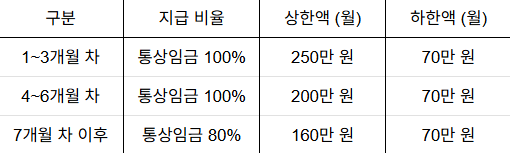 1. 급여 상한액 단계적 인상: 1~3개월 차에는 최대 250만 원, 이후 기간에도 기존보다 높은 상한액이 적용됩니다. (특정 조건 충족 시 월 300만 원 가능)