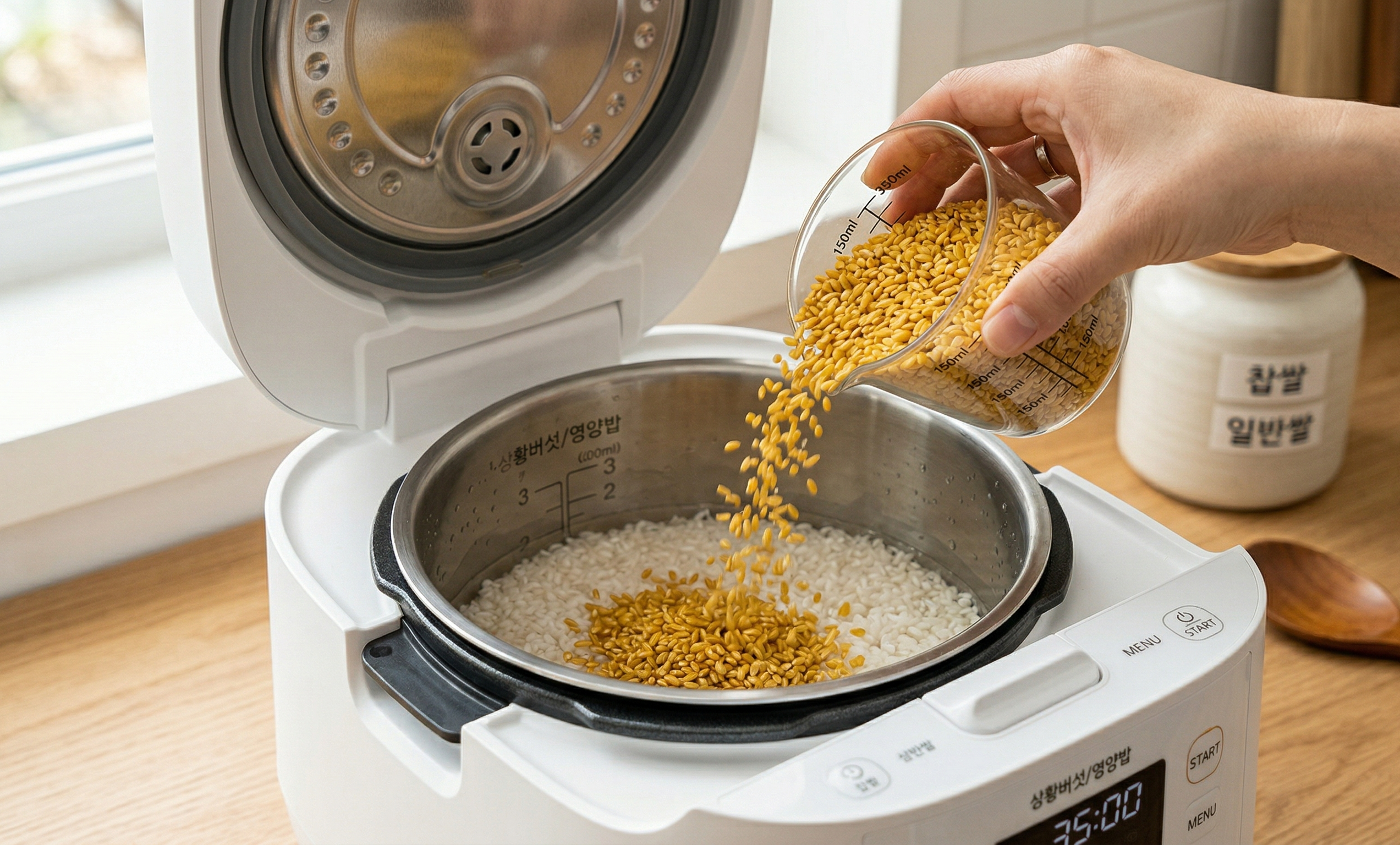 3. 충분한 불리기: 일반 쌀보다 10~20분 정도 더 불려주면 식감이 훨씬 부드러워집니다.